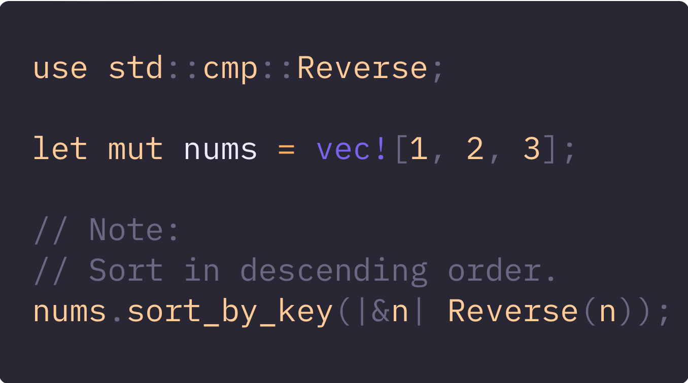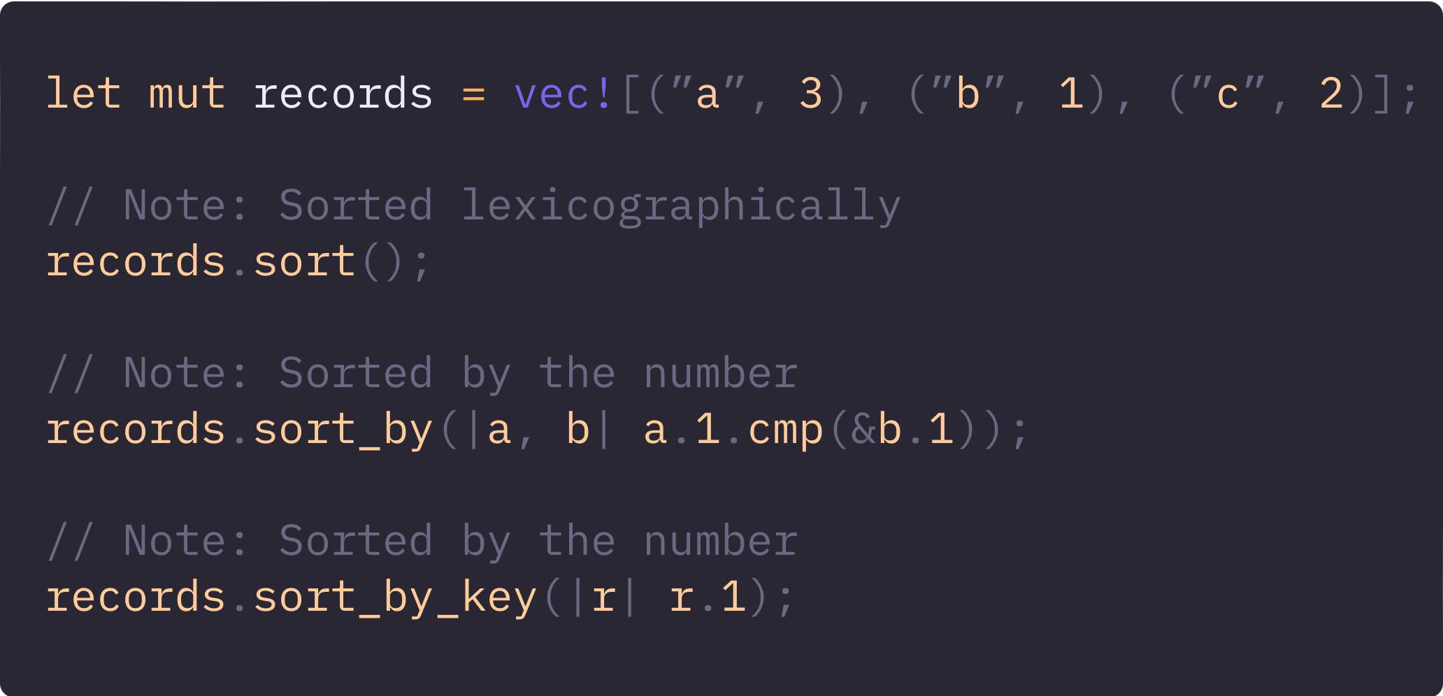 Sorting APIs leverage Ord by default, or accept comparators for custom logic.