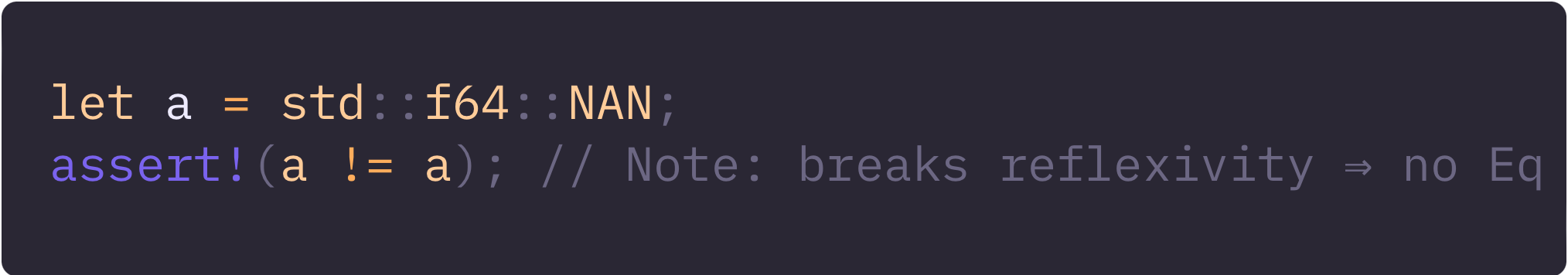 Equality: Eq must be reflexive — f64 can’t satisfy that because NaN != NaN.