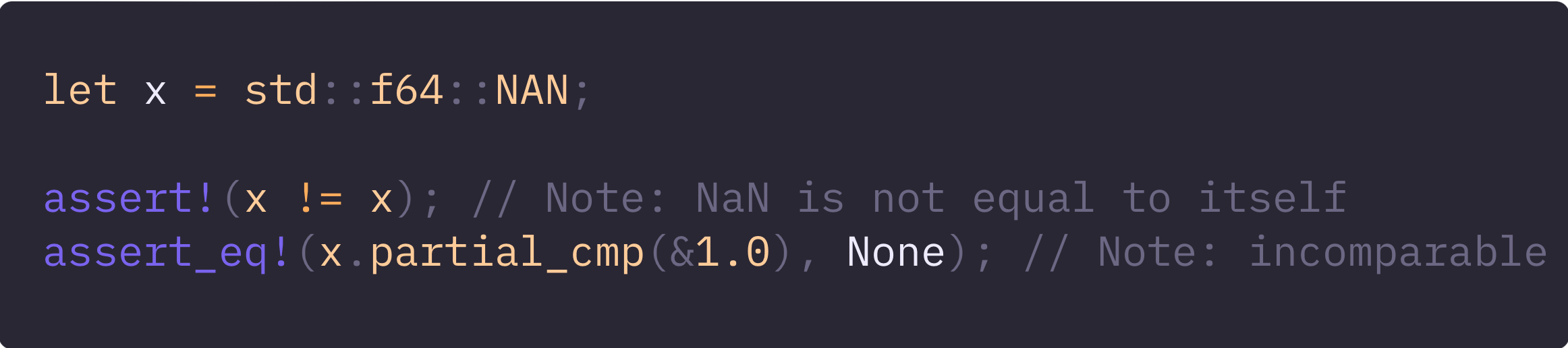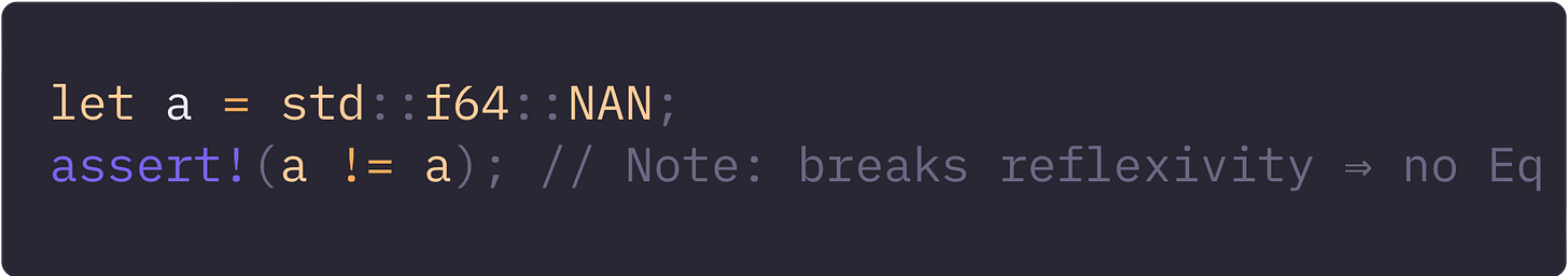 This rigor is why f64 cannot implement Eq or Ord: NaN violates reflexivity and totality.