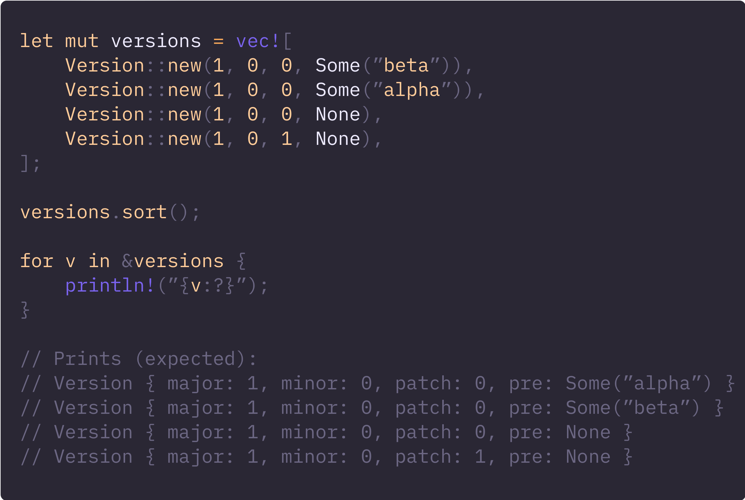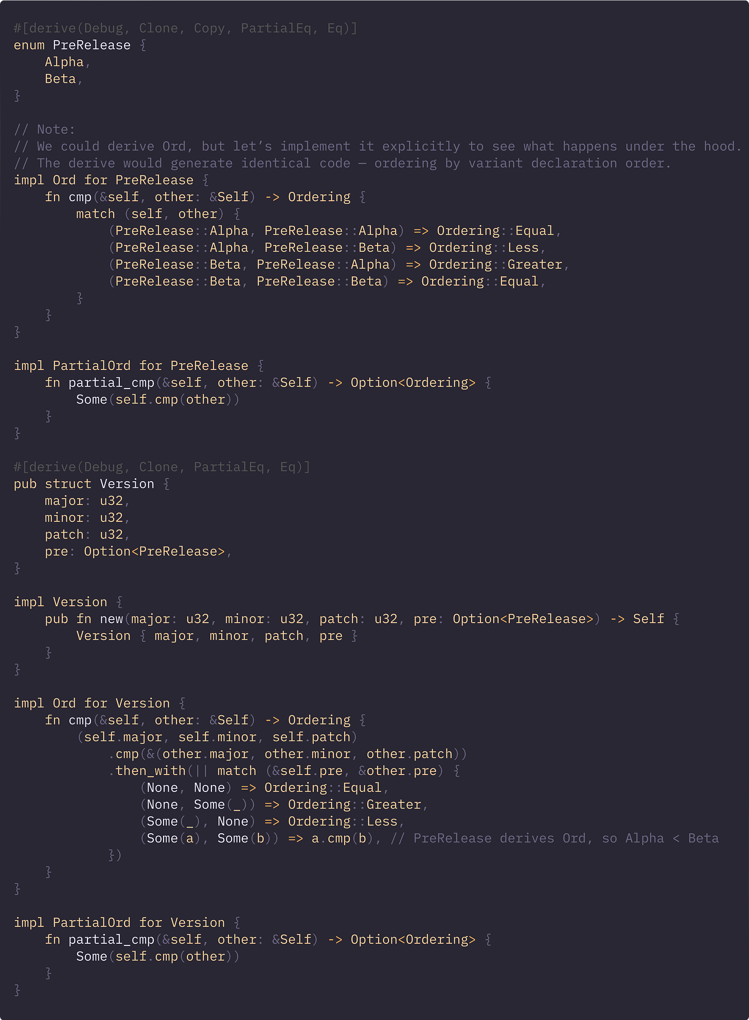 Let’s improve our Version type by replacing the String-based pre-release identifiers with a proper enum. This gives us type safety and explicit ordering.