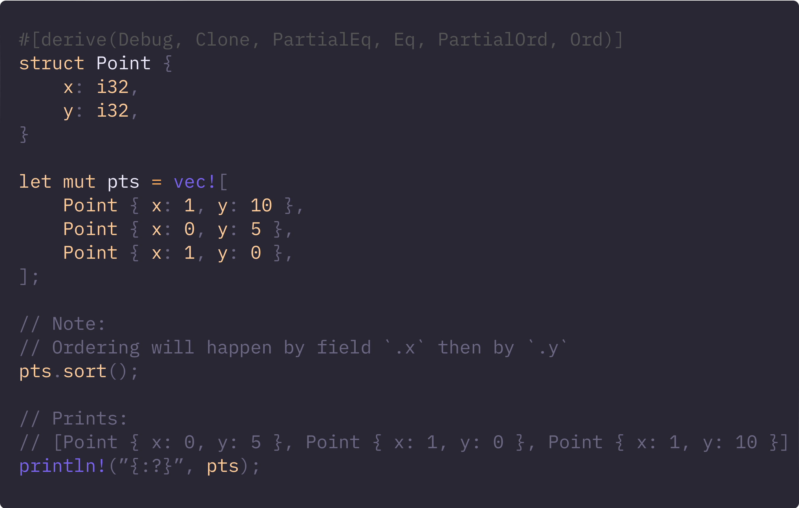 Ord implies Eq and provides a total order — it’s required by sorted collections like BTreeMap / BTreeSet and by sort() itself.