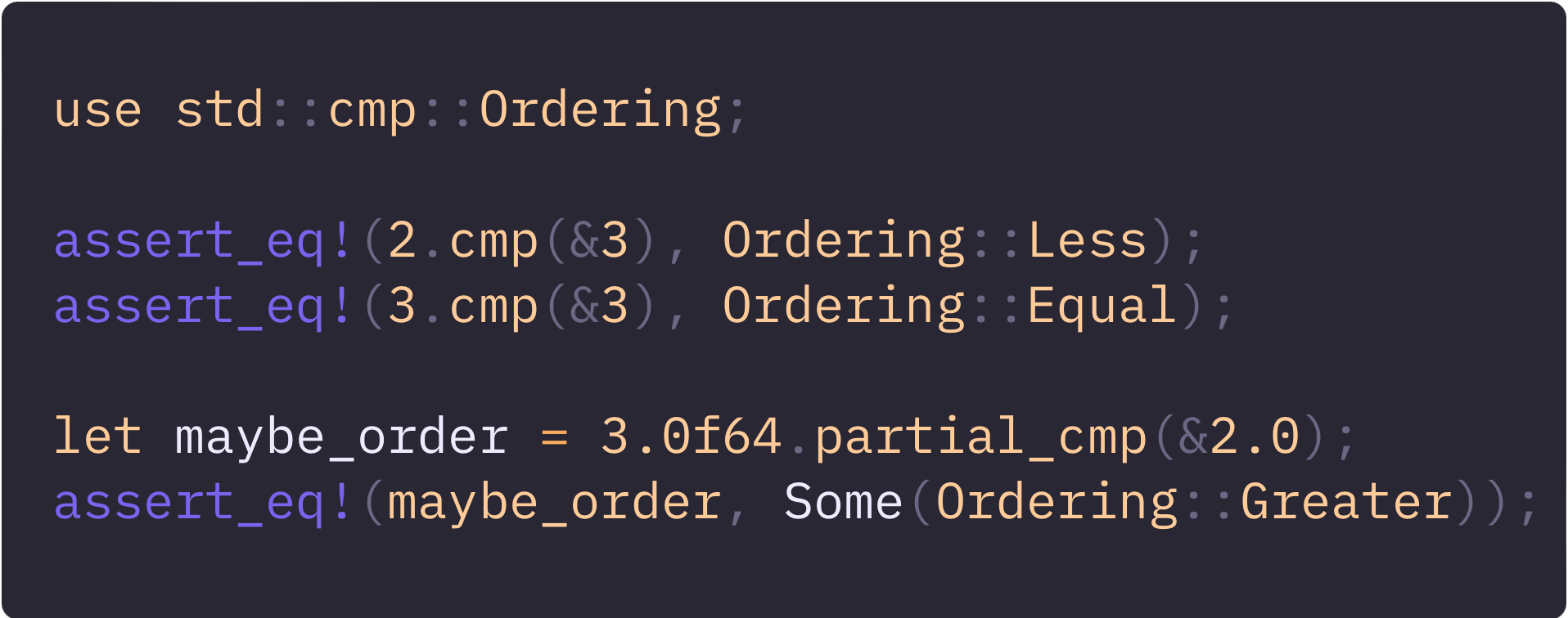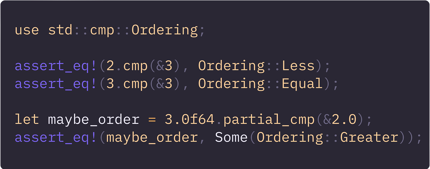Beyond the theory, comparisons show up constantly in everyday Rust through operators, explicit comparators, and trait bounds on collections.