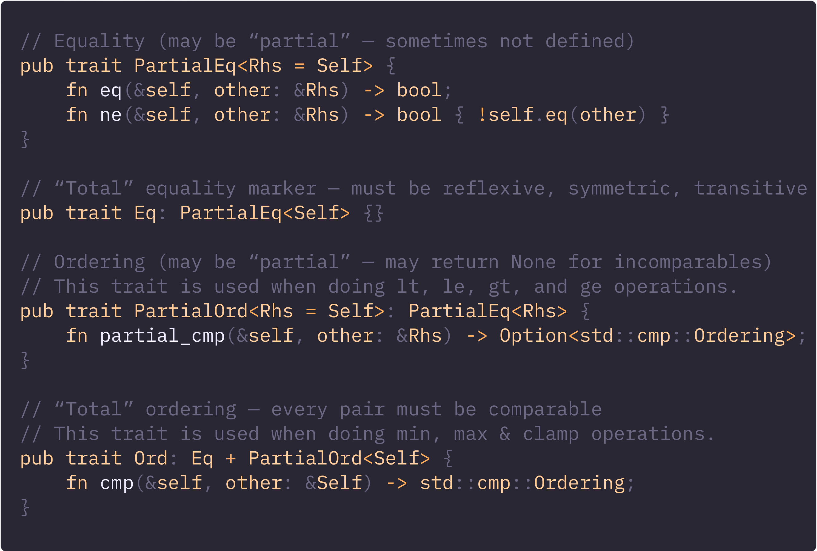 These traits come with algebraic laws that Rust expects implementations to uphold, ensuring predictable behavior in operators, sorting, and collections.