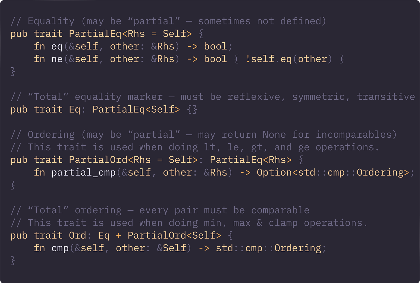 Rust splits equality and ordering into partial (PartialEq / PartialOrd) and total (Eq / Ord) variants to model real-world data correctly.