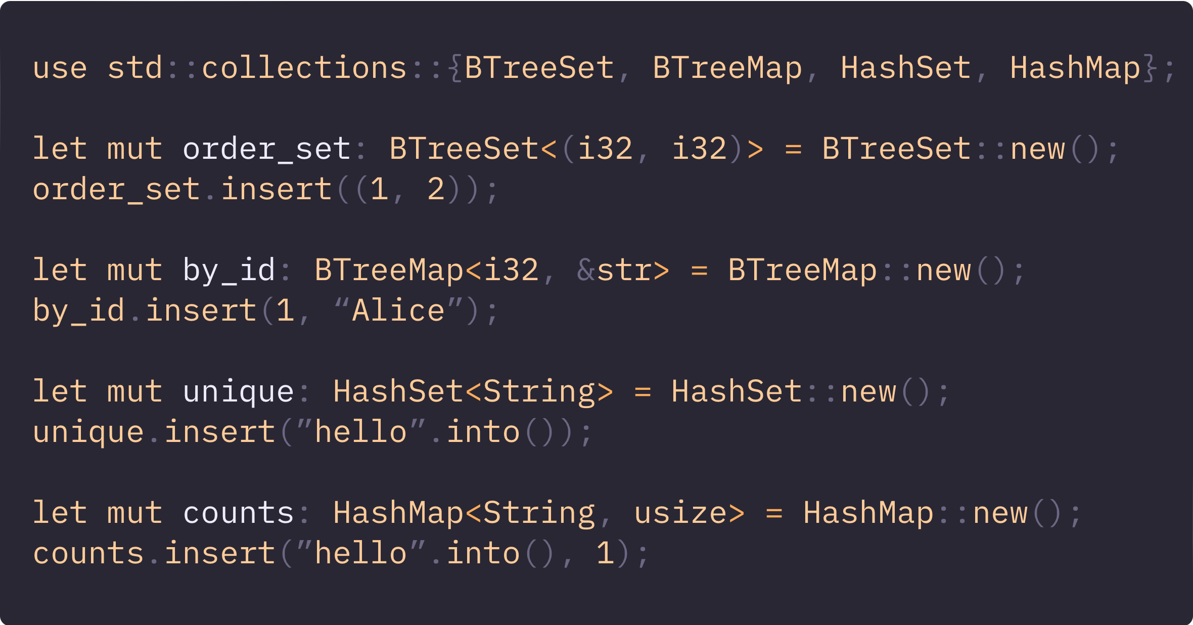 Many core collections and algorithms express their requirements via trait bounds such as Eq, Ord, and Hash.