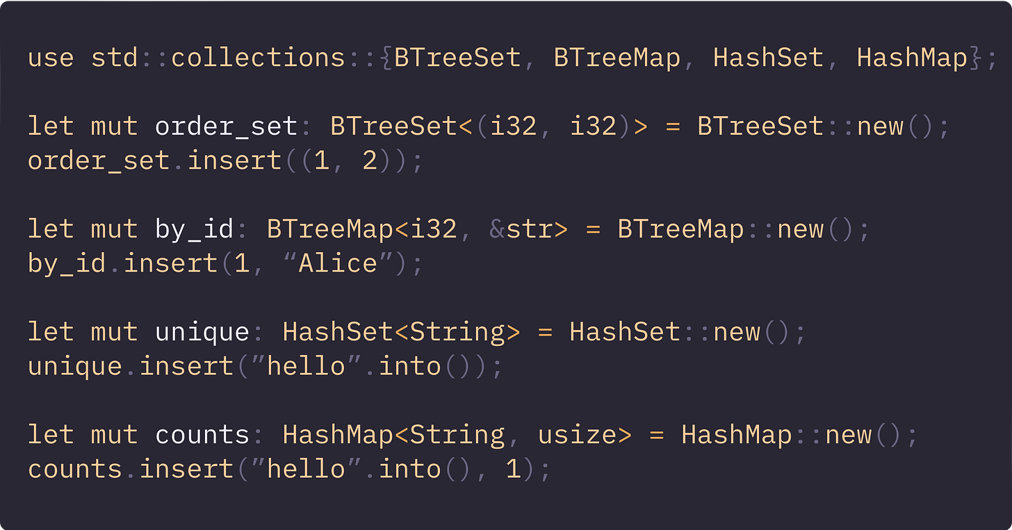 This section surveys the idiomatic patterns you’ll use most: == / != and < comparisons, cmp / partial_cmp, and where Eq / Ord drive sets, maps, and sorting APIs.