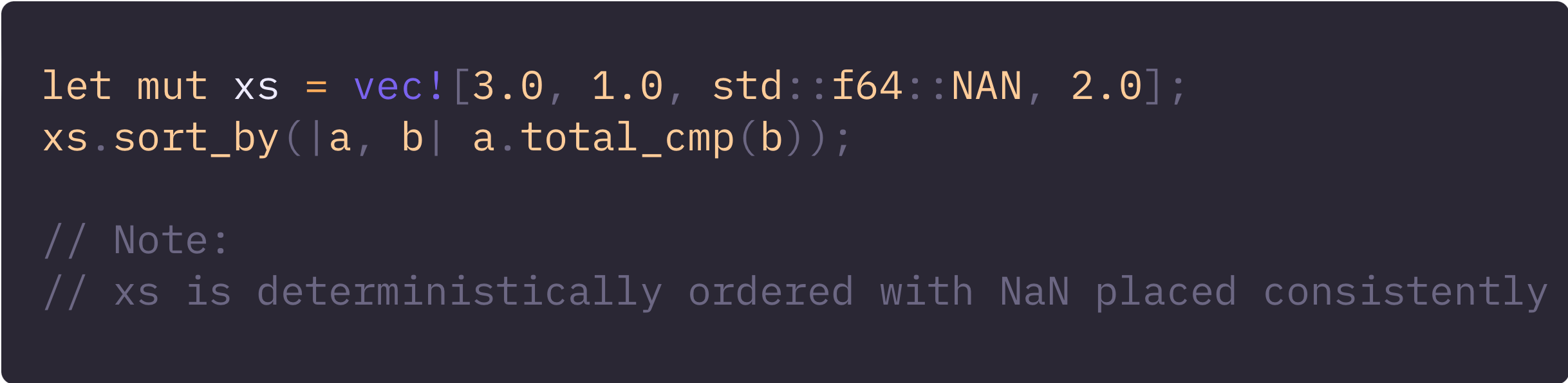 Ordering: Ord must be total; NaN breaks totality, thus we need to use total_cmp for deterministic sorting.