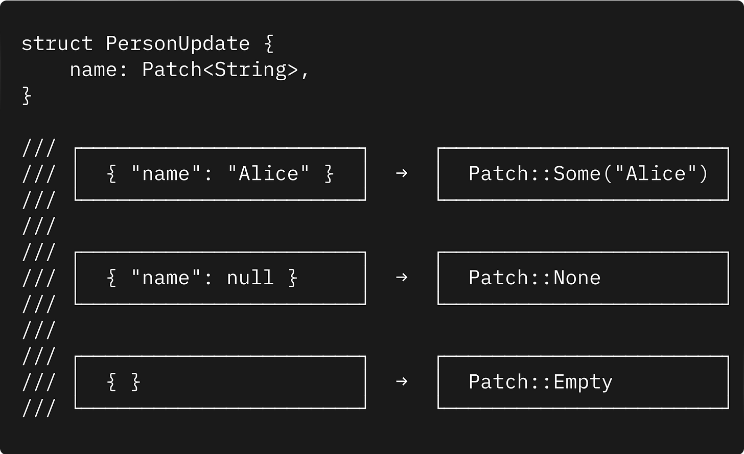 This gives us precise control over UPDATE & PATCH semantics — we can finally distinguish between “clear this field” and “leave it unchanged”: